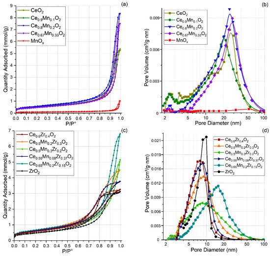Binary oxide systems consisting of CeMnOx are characterized by a hysteresis loop similar in shape to the one for CeO2 (Figure 1a,b), as well as a fairly wide distribution of pore sizes and a mean-specific surface area. The Ce0.9Mn0.1Ox sample is characterized by a pore size distribution with small and large pores with sizes of 2–4 nm and 5–50 nm, respectively (Figure 1d). The Ce0.6Zr0.4O2 sample is characterized by a hysteresis loop similar in shape to the one for zirconium oxide.