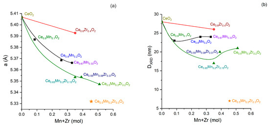 The Ce4+ substitution hinders the crystallite growth for the CeO2-ZrO2-MnOx samples (in the range of 7–21 nm), and this results in a microstrain increase (Δd/d = 0.0043–0.0094) due to the additional number of oxygen-anion vacancies formed in the Ce1−(x+y)ZrxMnyO2−δ solid solutions. When Mn dopant is added to CeO2, the crystallite size decreases slightly (see Figure 3b). Moreover, upon further increase in the Mn/Ce ratio, the crystallite size remains practically unchanged. When Zr dopant is added to CeO2, a slight decrease in the crystallite size is observed (from 28 nm to up to 26 nm). The simultaneous addition of Mn and Zr dopants to CeO2 leads to a significant reduction in the crystallite sizes. It is worth noting the significant reduction in the crystallite size (up to 7 nm) for the Ce0.5Mn0.2Zr0.3O2 sample, which is also characterized by the most significant decrease in the ceria lattice parameter.
