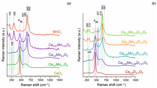 For the Ce0.8Mn0.2O2 and Ce0.67Mn0.33O2 samples, the bands at 192, 308, 649, and 690 cm−1 become more intense, and they are associated with the Mn–O vibrations in the α-Mn2O3 [53]. The appearance of weak bands at 310 and 366 cm−1 along with a strong band at 649 cm−1, which is clearly overlapped with one of the bands related to α-Mn2O3, is associated with the vibrational stretching of the Mn-O bond towards Mn2+ ions in the spinel structure of Mn3O4 [53]. In addition, the appearance of the band at 537 cm−1, which is associated with defect areas including O2− vacancies and is observed when the dopant cations in a M3+ state are introduced into the CeO2 lattice [45,54], and as mentioned above, the shoulder at 590 cm−1, are associated with the defect areas in the 8-fold coordination of O2−. Thus, for the CeMnOx samples, the introduction of Mn ions, mainly Mn3+, into the CeO2 lattice is observed, while the formation of α-Mn2O3 and Mn3O4 cannot be excluded, which is consistent with the XRD data.