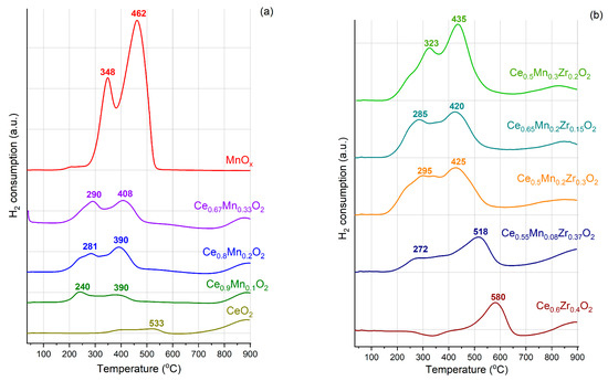 TPR profiles for the obtained samples: (a) individual and Ce-Mn oxides, (b) Ce-Zr and ternary oxides.