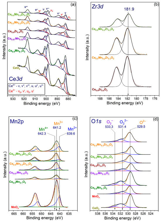 The XPS Ce3d spectrum (Figure 6a) shows the presence of Ce3+ and Ce4+ states, and the splitting into sublevels Ce3d5/2 and Ce3d3/2 occurs due to the spin–orbit interaction. Three lines at v/u, v″/u″, and v‴/u‴ and two lines at v′/u′ and v0/u0 are related to CeO2 and Ce2O3, respectively [41]. The Ce3+ and Ce4+ states are characterized by the peaks at v0, v′, u0, and v′ and v, v″, v‴, u, u″, and u‴, respectively. The Zr3d spectra (Figure 6b) feature the Zr3d5/2 binding energy of 181.9 eV related to the Zr4+ state. The Mn2p spectra (Figure 6c) contain Mn2p3/2–Mn2p1/2 doublets, where peaks at 639.7, 641.2, and 642.2 eV correspond to Mn2+, Mn3+, and Mn4+ states, respectively [65] that can be attributed to MnO, Mn2O3, and MnO2 [66,67], respectively. The deconvolution of O1s spectra (Figure 6d) contain three peaks with the binding energies of 533.8, 531.7, and 529.4 eV. These peaks are attributed to O2−, O22−, and O2− states that correspond to adsorbed water, active surface O species/surface hydroxyls, and lattice oxygen [68].