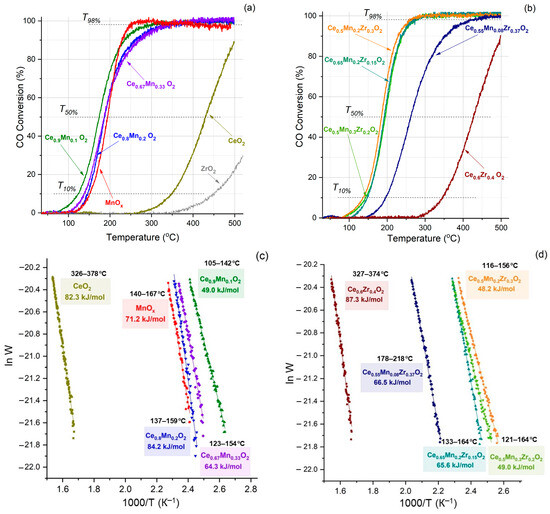 Catalytic properties of prepared systems in CO oxidation: (a) individual and Ce-Mn oxides, (b) Ce-Zr and ternary oxides; (c,d) corresponding activation energies.