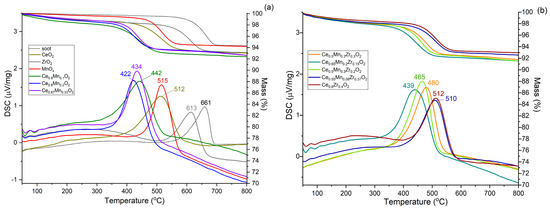 Simultaneous thermal analysis was used to determine the catalytic activity of oxide catalysts in soot oxidation. Figure 10 shows the TG and DSC curves obtained from soot oxidation simulations using the resulting catalysts. Non-catalytic soot oxidation is observed in the temperature range 550–700 °C with Tmax at 661 °C. The presence of ZrO2 leads to a slight increase in soot oxidation activity (Tmax = 613 °C) (not shown). The presence of cerium and manganese oxides decreases the maximum temperature to 512 °C and 515 °C, respectively. The presence of binary and ternary oxide systems shifts the reaction temperature range to 350–600 °C (i.e., it decreases the reaction temperature range by 100–170 °C). Samples Ce0.8Mn0.2O2 and Ce0.65Mn0.2Zr0.15O2 showed the highest activity: the maximum conversion temperatures for these samples were 422 and 439 °C, respectively. Comparisons of soot combustion and CO oxidation performances of the prepared samples and counterparts presented in the literature are presented in Tables S1 and S2 (Supplementary materials). The materials obtained show comparable activity.