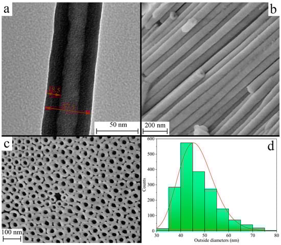 Figure 1. Images of synthesized nanotubes obtained using TEM (a), SEM (b,c). The size distribution of nanotube diameters is shown in (d).