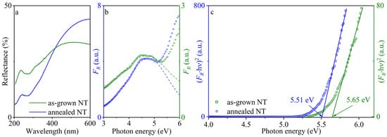 Figure 3. (a) The diffuse reflectance spectra measured for as-grown (green) and annealed (blue) nanotubes. (b) Absorption spectra FR(hν) converted using Kubelka–Munk formalism, dashed curves denote a Gaussian-shaped shoulder that emerged because of oxygen vacancy absorption. (c) The intrinsic absorption edge plotted in Tauc coordinates for direct allowed transitions taking defect absorption into account.