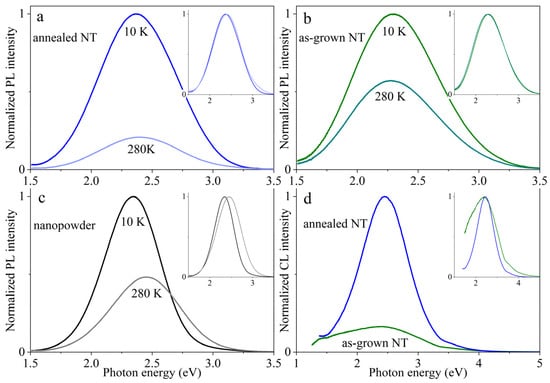 Figure 4. PL spectra for the studied NTs at temperatures of 10 K and 280 K (a,b), respectively. Spectra for as-grown NTs are shown in green, and spectra for NTs after annealing are shown in blue. For comparison, the PL spectrum of the nanopowder is shown (c). Cathodoluminescence spectra (d) were measured at room temperature. The spectra normalized to their own maxima for a visual shape comparison are depicted in the insets.
