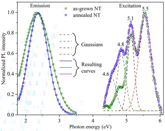 The photoluminescence excitation spectra (PLE) of hafnia nanotubes can be seen in Figure 5. They contain four maxima, and their positions are almost unchanged after high-temperature treatment. The peaks at 4.6, 4.8 and 5.1 eV fall into the optical absorption region for oxygen vacancies [36] (see also the spectral shoulder in Figure 3b), and the 5.5 eV maximum rests in the region of optical band-to-band transitions near the intrinsic absorption edge (see Figure 3). The comparison of normalized PL spectra in Figure 5 points to the fact that the luminescence band for as-grown NTs at room temperature is slightly wider and insignificantly shifted to lower energies in comparison with a similar peak for annealed NTs.