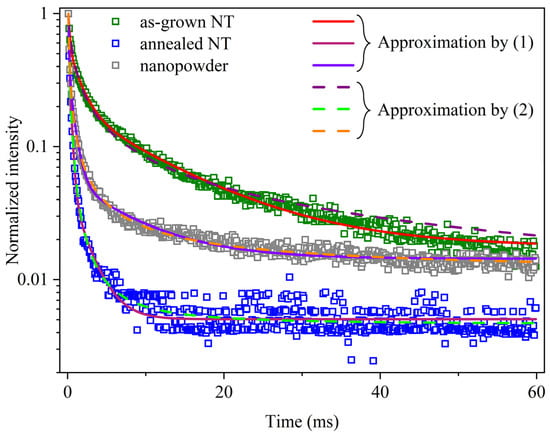 In order to study the kinetic peculiarities of the observed PL, a quantitative analysis of the decay curves was carried out. Emission was recorded at spectral maxima for each sample, such as 2.27 eV (as-grown NTs), 2.4 eV (annealed NTs), and 2.45 eV (nanopowder). Figure 6 shows the measured time dependencies.