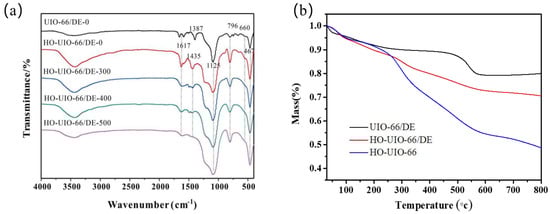 The FT-IR spectra of catalyst samples synthesized at different calcination temperatures are shown in Figure 2a. Compared with the UIO-66/DE-0, the HO-UIO-66/DE-0 peak has obvious hydroxyl groups on the surface of the catalyst. The peak between 3700 cm−1–3000 cm−1 and the peak at 1617 cm−1 are attributed to the stretching vibrations of hydroxyl functional groups in the sample [28]. With the increasing calcination temperature, the vibrational tensile peak of the hydroxyl group decreases. The IR bands at 1435 cm−1 and 1387 cm−1 correspond to the -COOH functional group in the ligand [34]. With the increase in the calcination temperature, this band intensity decreases, which implies a reduction in surface defect sites [28]. The 660 cm−1 is ascribed to Zr-O bond vibrations [35]. For diatomite, the sharp band at 796 cm−1 was observed at strong asymmetric Si-O-Al stretching vibrations, and the bands at 1125 cm−1, 796 cm−1, and 467 cm−1 correspond to the structural deformation of diatomite [36,37].
