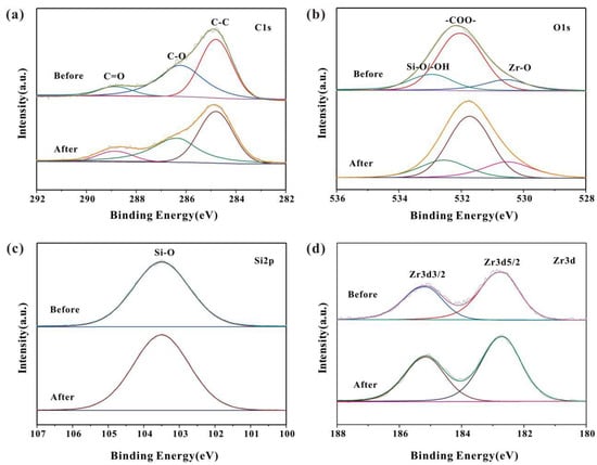 XPS spectra of C1s (a), O1s (b), Si2p (c), and Zr3d (d) for HO-UIO-66/DE-300.