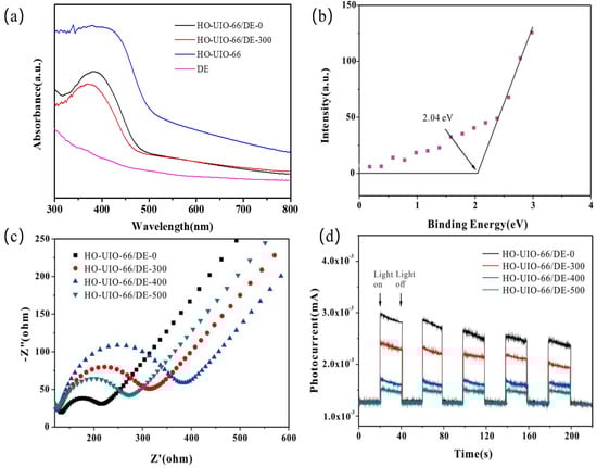 UV−DRS spectra (a), VB XPS spectrum of HO-UIO-66/DE-300 (b), EIS Nyquist plots (c), and (d) photocurrent responses of synthesized photocatalysts.