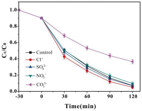 Under the optimal conditions used, the effects of Cl−, SO42−, NO3−, and CO32− on SMX degradation were examined, as shown in Figure 6. In agreement with previous data [47], the degradation of SMX accelerated after the addition of Cl−. The Cl− is an effective •OH scavenger; however, by this process, Cl• can be generated, which favors the rapid degradation of SMX due to the relatively high standard redox potential of Cl• being similar to that of •OH [48,49,50]. The presence of NO3− and SO42− had no significant effect on the degradation of SMX. In addition, with the addition of CO32−, the degradation efficiency of SMX decreased due to the quenching of •OH and •O2− [51].