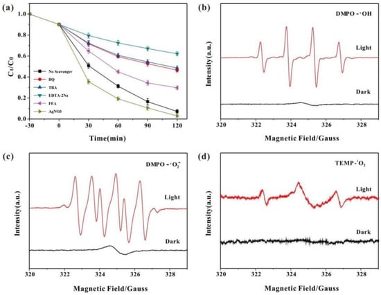 The effects of visible light irradiation and H2O2 concentration on the catalytic efficiency of HO-UIO-66/DE-300 were also examined, as shown in Figure 5c. In the absence of the catalyst, visible light irradiation and H2O2 concentration exert no significant effect on SMX degradation. When H2O2 and visible light were added, the degradation rate of the UIO-66/DE-0 and UIO-66/DE-300 catalysts on SMX was not obvious. Under dark conditions, the Fenton-like reaction was carried out by adding H2O2 and HO-UIO-66/DE-300, and the degradation efficiency of SMX was only 44.6%. When irradiated with visible light, the SMX degradation efficiency was low. Under the cooperative condition of visible light and H2O2, many reactive oxygen species (ROS) were produced in the HO-UIO-66/DE-300/light/H2O2 system, and the degradation efficiency of SMX was significantly improved [41].