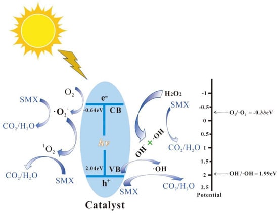 As shown in Figure 9, we proposed a possible mechanism of SMX degradation by HO-UIO-66/DE-300 under light irradiation. Electrons and holes are photo-generated upon visible light irradiation of HO-UIO-66/DE-300, enhancing a charge transfer between ligand and metal clusters. Due to the negative CB potential (−0.64 eV) of HO-UIO-66/DE-300, the excited electrons can reduce the dissolved O2 in solution to form •O2− [40], and it can combine with the h+ generated by HO-UIO-66/DE-300 to generate 1O2, and the generated e− reacts with H2O2 to generate •OH and OH−; OH− is continuously oxidized to •OH by h+ [57].