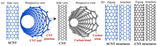 The structures of CNTs vary as the arrangements of carbon bonds and are distinguished by the chirality vector. In terms of chirality, CNT structures can be categorized into three typical types: armchair, zigzag and chiral. Similarly, SCNTs possess various chiralities due to the different arrangements of CNT units. In this study, both zigzag and armchair chirality are applied to both SCNTs and CNTs, as shown in Figure 1b.
