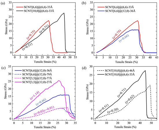 In Figure 3a, the same CNT with a chirality of (6,6) and a length of 33Å is applied to fabricate two different SCNT structures: armchair SCNT[6,6]@(6,6) and zigzag SCNT[10,0]@(6,6). From Figure 3a, it is evident that these two SCNTs exhibit different tensile behaviors. The armchair SCNT[6,6]@(6,6) tends to have a linear stress–strain curve with a stable slope of 0.75. Differently, the tensile curve of the zigzag SCNT[10,0]@(6,6) has two linear stages with different curve slopes of 0.51 and 0.71.