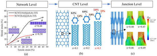 Hierarchical deformation process of SCNTs. (a) Network-level deformation of SCNT: remarkable shrinkage in the radial direction and different morphology transformations of armchair and zigzag SCNTs; (b) CNT-level deformation of SCNT: increments in CNT length and elongations of carbon bonds; (c) junction-level deformation of SCNT: expanding stress-concentration area of the junction.