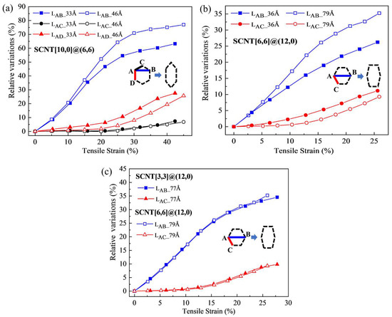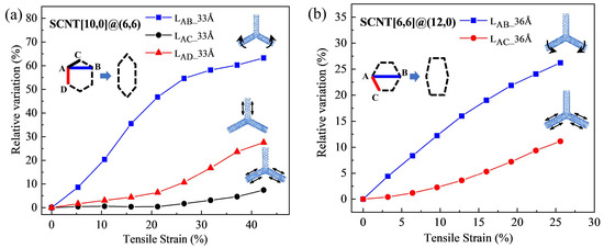 Furthermore, it should be noted that zigzag and armchair SCNTs exhibit different characteristics in the variation curves, indicating distinct deformation modes. In the case of the zigzag SCNT[10,0]@(6,6), the curve of the angle variation (blue line) initially has a considerable increase but gradually slows down after the strain of 20%. Conversely, the length variation curves (red and black lines) remain at a very low level at the early stage and start to increase after the strain of 20%. As for armchair SCNT[6,6]@(12,0), the increase in both the length and angle variation have almost stable slopes compared to those of zigzag SCNTs.