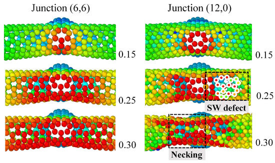 Regarding the CNT chirality, its impact becomes significant in the later stage of tensile curves, which was illustrated in the first part of the discussion. The corresponding reason is analyzed in Figure 7. There are two junction areas taken from the SCNT[6,6]@(6,6)-33Å and SCNT[6,6]@(12,0)-36Å, which have the same SCNT structure but are fabricated by CNTs with different chirality. Remarkable stress concentration can be seen for the junction areas of both two structures, but the two junctions present totally different topology structures. Under the strain of 0.25, distortions of hexagons are observed for the junction area connected by the (12,0) CNT, which is the so-called Stone–Wales defect as the precursor of fracture [53]. However, the junction topology structure of (6,6) CNT is unchanged under the same strain of 0.25. When the strains increase to 0.3, higher levels of stress concentration occur in the junction area. An explicit necking can be seen for the area of junction (12,0), while the atomic lattice of junction (6,6) is still unchanged. Therefore, the junction structure of (6,6) CNT is much more stable than that of the (12,0) CNT.