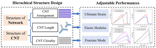 With a comprehensive understanding of the structure-dependent mechanical performances of SCNTs, a basic design strategy based on the hierarchical structure can be developed for SCNTs (illustrated in Figure 8). The major factors influencing the geometrical parameters, such as CNT arrangement, CNT length and CNT chirality, can be divided into two levels of structure: the structure of the CNT and the structure of the SCNT. Accordingly, changes in structure at both the CNT and network levels significantly affect the mechanical performance of the resulting models. It is worth noting that the CNT length belongs to both the group of network structure and CNT structure. Therefore, the CNT length plays multiple roles in the mechanical performances of SCNTs. It was concluded by previous discussions that CNT length determines the starting point of CNT stretching and affects the ranges of the angle variation at the same time.