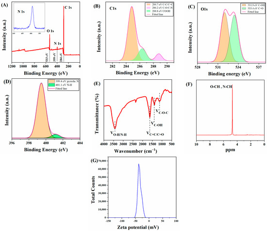 Characterization of functional groups contained in C-CDs: (A) XPS image of C-CDs; (B) C1s, (C) O1s, (D) N1s high-resolution spectra; (E) IR spectrum of C-CDs; (F) 1H nuclear magnetic resonance spectrum (NMR) of C-CDs; (G) Zeta potential map of C-CDs.