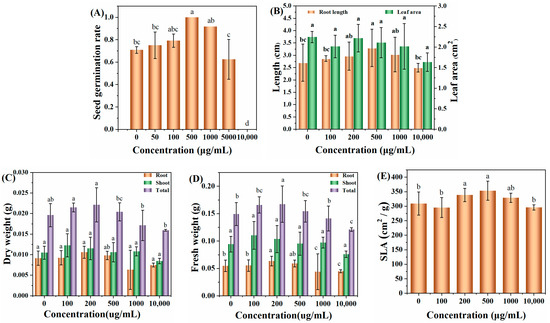 Effects of hydroponic cultivation with different concentrations of C-CDs on wheat phenotypes: (A) the effect of C-CD aqueous solution culture on the germination rate of wheat seeds; (B) effect of C-CDs on wheat seedling root length and effect of leaf area; (C) effect of different concentrations of C-CD nutrient solution on leaf dry weight, root dry weight, and dry biomass of wheat seedlings; (D) different concentrations of C-CD nutrient solution on wheat seedlings leaf fresh weight, root dry weight, fresh weight, and fresh biomass; (E) Effects of different concentrations of C-CD nutrient solution on specific leaf area of wheat seedlings. Different letters indicate significant differences.