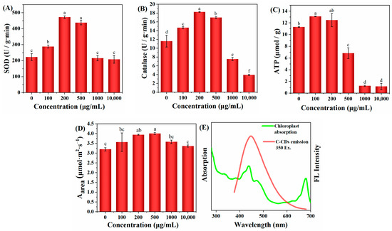 Effects of different concentrations of C-CDs in hydroponics on physiological indices of wheat: (A) effects of different concentrations of C-CD nutrient solution on superoxide dismutase activity; (B) effects of different concentrations of C-CD nutrient solution on catalase activity; (C) effects of different concentrations of C-CD nutrient solution on ATP production; (D) the effect of C-CD aqueous solution culture on the photosynthetic rate per unit area of wheat seedlings; (E) chloroplast absorption spectrum (green) and emission spectrum of C-CDs (red). Different letters indicate significant differences.