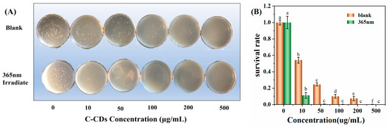 Effects of different concentrations of C-CDs on S. aureus: (A) inhibition of S. aureus by different concentrations of C-CDs under no light and 365 nm irradiation; (B) survival rate of S. aureus in the presence of different concentrations of C-CDs; (C) SEM images of S. aureus before (left) and after (right) with C-CDs. Different letters indicate significant differences.