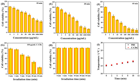 It was further observed that the survival rate of cells under 100 μg/mL C-CD conditions was 46.2% when the light time was 30 min and only 25% when the C-CDs concentration was 100 μg/mL for 60 min (Figure 8G). However, when no additional light was added, Figure 8A showed that different concentrations of C-CDs (0, 1, 5, 10, 50, 100, 500, 1000, 5000 μg/mL) had essentially no effect on HeLa cell activity while 365 nm light had essentially no effect on HeLa cell activity without the addition of C-CDs, as shown in Figure 8H. As can be seen from Figure 8I, the solution temperature was not any higher when 365 nm irradiation was performed in the presence of C-CDs compared to the PBS buffer. Thus, it was ruled out that C-CDs absorbed heat to damage HeLa cells. The above results suggest that the specific wavelength irradiation at 365 nm is the critical condition leading to C-CDs’ toxicity to cells.