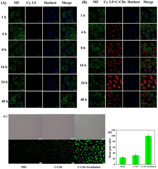 Cellular uptake of C-CDs: HeLa cells were incubated with Cy3.5 (A) and Cy3.5-labeled C-CDs (B) For 1 h, 4 h, 8 h, 16 h, 24 h, and 48 h under confocal microscopy. Bottom image, cell filaments (MF) were stained with phalloidin in green, and nuclei were stained with Hochest 33342 in blue, scale bar is 50 µm; (C) DCFH-DA probe was used to label PBS and the generation of intracellular ROS after 365 nm LED illumination after C-CDs, scale bar = 50 µm; (D) green light grayscale intensity of HeLa cells.