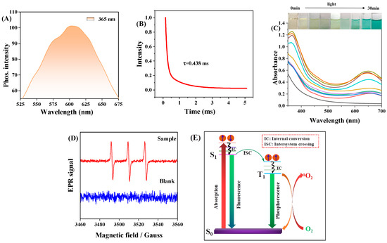 (A) Phosphorescence spectra of C-CDs under 365 nm light excitation; (B) phosphorescence lifetime of C-CDs; (C) absorption spectra of C-CD aqueous solution with added TMB under 365 nm light irradiation with time; (D) EPR spectra of 10 μL TEMP (10M) mixed with 2 μL C-CDs (10 mg/mL) under 365 nm light irradiation (TEMP is a unique spin trap of 1O2); (E) C-CD fluorescence and phosphorescence and O2 to 1O2 energy transfer process.