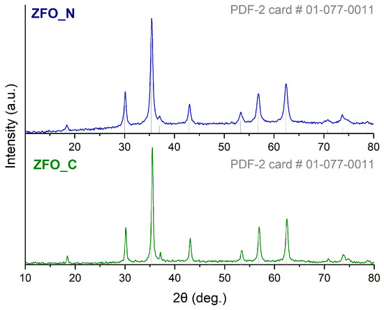 The as-prepared ZFO samples were first characterized by X-ray diffraction (Figure 1). Both synthetic routes allow one to obtain only the ZnFe2O4 phase without any impurities. The XRD pattern showed that the ZFO_N sample was less crystallized in comparison with the ZFO_C sample. The lattice parameters and crystallite sizes, calculated from the Scherrer equation, are given in Table 1. The ZFO_C nanospheres were less dense and had a higher value of crystallite size.