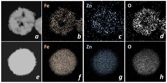 EDS maps of ZFO_C (a–d) and ZFO_N (e–h) samples: TEM images (a,e), Fe map (b,f), Zn map (c,g), O map (d,h).