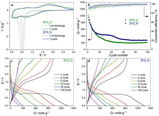 For both materials, a sharp capacity drop to about 500 mAh∙g−1 is observed during the first fifteen cycles (Figure 5b) due to conversion mechanism reaction of ZFO resulting in phase transformations [18]. During the following cycles, ZFO_N has the better cyclability, with an insignificant capacity fading after the 40th cycle and, as a result, 276 mAh∙g−1 is still observed at the 100th cycle. For ZFO_C, only 210 mAh∙g−1 remains after 100 cycles, and a slight capacity growth starts after the 70th cycle due to the continuous formation of the solid electrolyte interphase, which is electroactive due to non-faradaic reactions on its surface [19,20]. The coulombic efficiency of the first charge/discharge process is low, 75% and 71% for ZFO_C and ZFO_N, respectively, as usual for ZFO-based materials, but it increases in subsequent cycles to 100%.