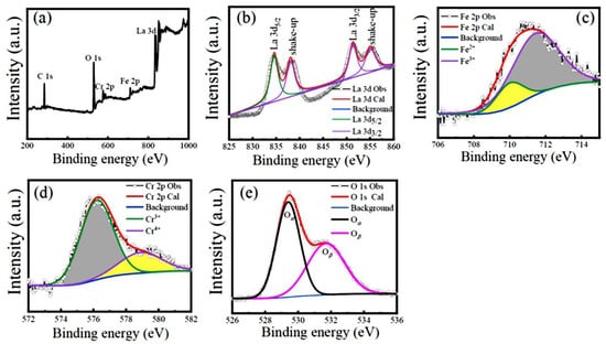 XPS spectra of (a) survey scan, and (b–e) high-resolution scan of La 3d, Fe 2p3/2, Cr 2p3/2, and O 1s for the LFCO powders.