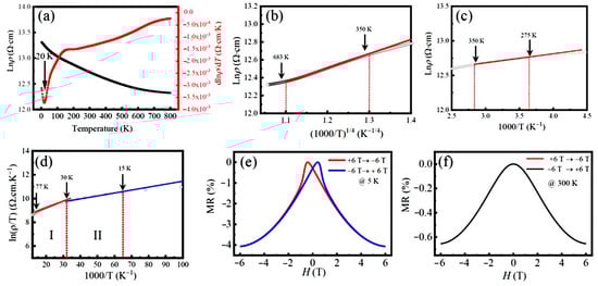 The linear fitting of the ln(ρ/T) vs. (1000/T) curve shown in Figure 7d yields the Ea values for the small polarons hopping, which are 4.85 meV and 2.20 meV, respectively, in the two temperature regions, I (30–77 K) and II (15–30 K).