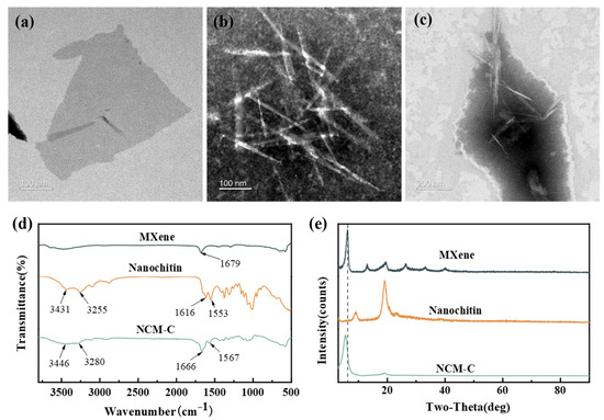 TEM images of (a) Ti3C2Tx MXene, (b) nanochitin, and (c) NCM-C composite. (d) FTIR spectra and (e) XRD image of Ti3C2Tx MXene, nanochitin, and NCM-C.