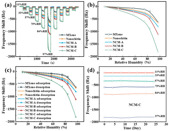 In the domain of humidity sensors, sensitivity refers to the magnitude of change in the sensor’s output signal corresponding to variations in humidity. It is typically quantified as the ratio of the change in the sensor’s output signal (frequency shift ) to the relative humidity level . Figure 3a illustrates the dynamic frequency response of the five QCM sensors prepared in this experiment under different humidity conditions. As shown in Figure 3b, within the humidity range of 11.3% to 97.3%, the maximum frequency shifts of Ti3C2Tx MXene, nanochitin, NCM-A, NCM-B, and NCM-C are measured as 624.89 Hz, 632.51 Hz, 785.9 Hz, 1097 Hz, and 1766.61 Hz, respectively. The corresponding sensitivities are calculated as 7.27 Hz/%RH, 7.35 Hz/%RH, 9.14 Hz/%RH, 12.76 Hz/%RH, and 20.54 Hz/%RH. These results demonstrate a substantial improvement in the sensitivity of the QCM humidity sensor based on Ti3C2Tx MXene upon incorporating nanochitin.
