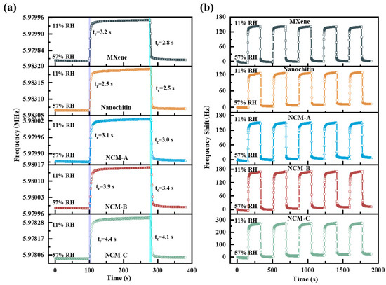 In the ambient environment, the humidity-sensitive film of the QCM humidity sensor undergoes a continuous process of water absorption and desorption. If the environment is stable, these two processes gradually reach dynamic equilibrium. In practical humidity measurement, changes in the environmental humidity induce alterations in the frequency response of the sensor. Because the frequency change in the QCM sensor is typically exponential, the response/recovery time refers to the time required for the sensor to respond to humidity changes and reach a stable state at 63.2% of the final value. A shorter response/recovery time indicates better sensor performance. We conducted tests on the five sets of humidity sensors we prepared in a low humidity range of 57%RH to 11%RH. The results shown in Figure 4a indicate that the response times (tr) for Ti3C2Tx MXene, nanochitin, NCM-A, NCM-B, and NCM-C are 3.2 s, 2.5 s, 3.1 s, 3.9 s, and 4.4 s, respectively, while the recovery times (tc) are 2.8 s, 2.5 s, 3.0 s, 3.4 s, and 4.1 s, respectively. The experimental findings demonstrate a positive correlation between the amount of nanochitin adhered to the surface of Ti3C2Tx MXene and the corresponding increase in sensor sensitivity. However, at the same time, the response/recovery time also becomes longer.