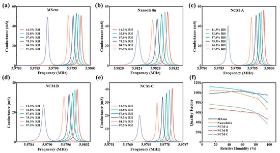 Conductance spectrum analysis serves as an effective approach for investigating the electrical characteristics and mechanical properties of QCM sensors. Figure 5a–e present the conductance spectra of Ti3C2Tx MXene and nanochitin-coated QCM sensors measured using a vector network analyzer at different relative humidity levels. When the resonant state is stable, all parameters of the QCM vibration can be detected. As the humidity level rises, the conductance peak of the QCM sensor undergoes a frequency shift towards lower frequencies, accompanied by a gradual widening of the half-bandwidth (). The quality factor () can be defined as the ratio between the maximum frequency value () and the HBW: