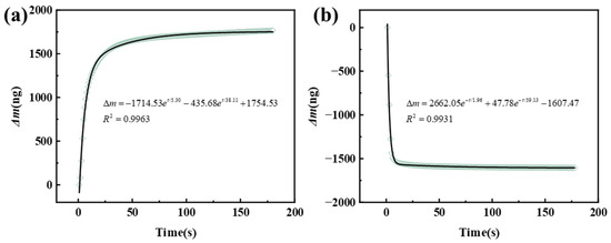 The fitting curve of the modal exponential dynamics model of the NCM-C. (a) Adsorption process and (b) desorption process.