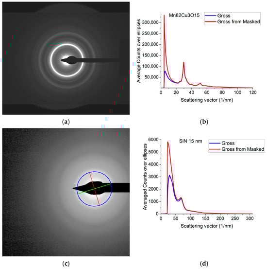 Electron diffraction pattern from nanocrystalline Mn82Cu3O15 (composition determined by EDS) and from amorphous SiN thin films. (a) 2D pattern as recorded by the camera from nanocrystalline Mn82Cu3O15; (b) 1D intensity distribution, I(Q) obtained by averaging the intensity over the elliptically corrected rings. The Beam-Stop is shown to demonstrate the effect of Masking [32]; (c) 2D pattern from amorphous SiN. The blue circle and the two lines aid centering and are visualized optionally; (d) 1D I(Q) obtained from (c).