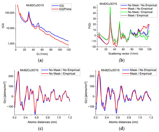 When the high-Q tail of F(Q) significantly deviates from zero (in contrast to approaching it), we need an empirical correction. The empirical correction is embodied in the removal of a 4th-order polynomial to compensate for the systematic differences between the calculated fi(Q)s and the true shape of the average trend in I(Q). Figure 3b compares variations in the shape of F(Q) when it is computed from non-masked and masked I(Q)s either by relying on empirical correction or disregarding it. Figure 3c,d compare G(r)s calculated from the 4 variants of F(Q) in Figure 3b in a restricted r-range to enhance the visibility of differences. One can see that whenever the shape of F(Q) deviates from the expected form (i.e., the high-Q part increases (in Figure 3b) in contrast to the expected oscillation around zero), false oscillations appear in G(r) (Figure 3c,d). The conclusion that the additional oscillations are false are supported in Section 2.8 Decomposition, where the measured G(r) is compared to a combination of computed ones. (Section 2.8 shows that simulated composite G(r) only contains the same oscillations and no more as the measured masked, empirical distribution shown in Figure 3d.)