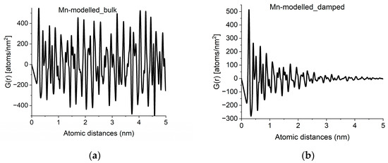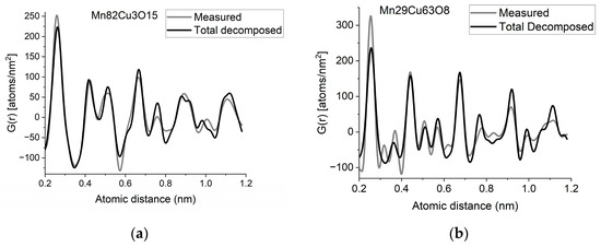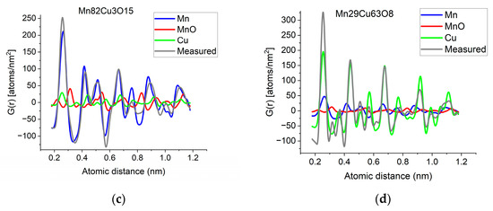 EDS analyses performed simultaneously with recording of the diffraction patterns provided the compositions of the samples. The knowledge of composition must be supplemented with information from other sources to facilitate reasonable selection of reference structures to be used in decomposition. Selection of phases generally relies on materials science considerations of the system, information from other measurements (e.g., X-ray photon spectroscopy, XPS, which indicates chemical bounds) or trial-and-error type selection of possible phases (with relevant compositions) from a structure database. In our case, alpha-Mn was selected (from several pure Mn structures) to fit a measured (and partially oxidized) Mn100Cu0 sample (not shown here). Oxygen content monotonically changed with Mn, so oxidation of Mn was assumed (in contrast to oxidation of Cu). The structure of MnO (out of several manganese–oxide structures) is a result of trial-and-error. Our decomposition procedure for the two samples in Figure 6 resulted in 82%Mn + 8%MnO + 10%Cu and 24%Mn + 4%MnO + 72%Cu, respectively. The G(r)s synthetized with these weights are shown in Figure 6. Although the agreement is not perfect, we can use it to follow trends in an approximate way. A detailed examination of systematic structure changes as a function of composition (in the entire range between pure Mn and pure Cu) from the point of structure evolution is the topic of a separate paper.