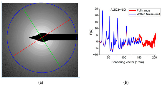 The F(Q) function is expected to oscillate around zero with decreasing amplitude at increasing Q-values. Both multiple scattering (from thicker samples) and unwanted stray radiation (together with signal intensities exceeding the linearity range of a camera) may cause deviation from this shape. In addition to the true distortions caused by scattering, the recorded pattern may also be distorted by the presence of shadowing elements (e.g., Beam-Stop) in the TEM in front of the camera. The effect of the latter is eliminated by Masking [32]. The effect of Masking on I(Q) is illustrated in Figure 3a. The logarithmic scale plot demonstrates that both the low-Q part and the high-Q part are influenced by shadowing elements and their effect is removed by the application of the Mask.