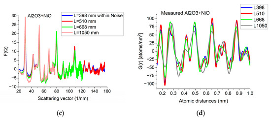 Since G(r) is calculated by FFT from F(Q), the discrete channel contents in the measured I(Q) (or better to say in F(Q), which is linearly related to them) are Fourier components of G(r). That is why oscillations with higher and higher Q result in better resolution (narrower peaks) in G(r). The extent of oscillations in the measured diffraction depends on cluster size (grain size). However, they may be truncated if the selected camera length in the TEM is too high. Consequently, the camera length should be low enough to record all the oscillations, which are present due to physical reasons. This effect can be best illustrated with nanocrystalline materials, where oscillations extend to higher Q-values (than in amorphous materials) due to the medium-range order. The recording medium (which practically means a camera in the present day) can also pose a limit to useful Qmax in the recorded diffraction, because information may be lost in the noise for the lowest intensities (highest Q-values) if the maximum intensity (at low Q) is limited by the dynamic range of the camera. The limiting effect of noise illustrated in Figure 5a–c proves that the information content in the common intervals of F(Q)s recorded with different camera lengths is the same; however, we can extend the useful information by using lower camera lengths. Figure 5d shows how the resolution of the pair correlation function G(r) is improved with increased Qmax. One can also see in Figure 5d that a too-short Q-range can lead to small shift of peaks and even changes in the number of detected peaks (false oscillations) in G(r). These false oscillations are also called termination ripples. It also demonstrates that when Qmax is high enough, a further increase only makes a very little change in G(r).