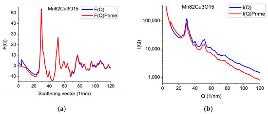 We can go one more step further and calculate back what shape the measured I(Q) should have been to result in F’(Q) during the processing. Reverse application of Equation (1) provides this I’(Q). Figure 7b compares the true measured I(Q) to the I’(Q) that resulted from the back-calculated F’(Q). The main difference between the I(Q) and I’(Q) is the average slope. It reflects the fact that the calculated average scattering decays faster with Q than the measured one. That difference is corrected empirically with the removal of a fitted polynomial. The enhanced intensity at higher Q-values is attributed to double (multiple) scattering within the sample.
