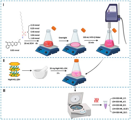 Figure 1 illustrates the strategy employed in this study to load the hydrophobic drug mimic NR into the LDHs. SDS was used as an intermediate storage medium for NR, and the overall construction process of LDH-SDS-NR was divided into three steps. Firstly, SDS/NR pre-encapsulation systems were prepared at different molar ratios of 2/1, 4/1, 8/1, 16.8/1, and 32/1, respectively. Subsequently, the ground MgAl-NO3 LDH was added to the SDS/NR mixed systems, which were redispersed in the aqueous solution using ultrasound. Finally, the LDH-SDS-NR intercalation systems under different molar ratios of SDS/NR were obtained by centrifugation, repeated washing via redispersion in water and methanol and subsequent centrifugation, and subsequent drying.