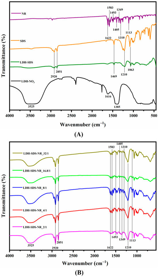 The FT-IR spectra of the LDH before and after NR loading are presented in Figure 2, and the principal vibrational assignments of components of the sample are summarized in Table 1. The broad asymmetric signal at 3525 cm−1 is observed in all LDH samples and can be attributed to the stretching vibration of the hydroxyl groups present in the layers of the LDH, which are bound to magnesium and aluminum, as well as the hydroxyl groups of the interlayer molecules [36]. The shoulder observed at 1616 cm−1 can be attributed to the bending vibration of water molecules [37]. Furthermore, the peaks in the range of 400 cm−1 to 800 cm−1 are assigned to the skeleton vibration of Mg-OH and Al-OH bonds within the LDH layers [38]. Meanwhile, the peak observed at 1385 cm−1 in LDH-NO3 corresponds to its interlayer NO3− ions [39]. Upon the intercalation of SDS, the LDH-SDS exhibits the emergence of new signals at 2920 cm–1 and 2851 cm–1, which can be assigned to the asymmetric stretching and symmetric stretching vibrations of CH2, respectively [40]. Furthermore, the appearance of new signals at 1210 cm–1 and 1063 cm–1 corresponds to the asymmetric and symmetric vibration peaks of S=O, respectively [41]. As shown in Figure 2B, the LDH exhibited characteristic peaks of NR after being loaded with SDS/NR at different molar ratios. In the 1622–1349 cm−1 region of all LDH-SDS-NR samples, the observed peaks correspond to the C-C stretching vibration of the aromatic ring in NR [42], while the peaks at 1310 cm−1 and 1113 cm−1 correspond to the stretching vibration of C-O in NR [43].