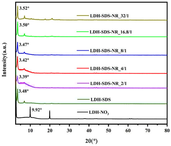 The XRD patterns of the LDH before and after NR loading are presented in Figure 3. For the LDH samples, the first diffraction peak observed in the XRD pattern corresponds to the (003) crystal plane of the LDH [44], and the distance between LDH layers can be calculated from the diffraction angle of the (003) plane combined with Bragg’s equation (2dsinθ = nλ) [45]. Meanwhile, the thickness of the LDH layers is typically 0.48 nm; thus, the interlayer spacing within the LDH can be further determined. Moreover, the positions and angle information of the (003) plane for all samples are marked in Figure 3, and the angle information of the (003) plane and the interlayer distance of the LDHs calculated accordingly are summarized in Table 2.